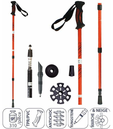 3 sections aluminium 6061 emboitables permettant un parfait ajustement Grip bi-densité TPR/PVC Dragonne réglable en nylon et néoprène pour un meilleur confort Pointe résistante en carbure de tungstène protégée par un embout caoutchouc antidérapant pour la marche Ajustable de 65 à 135 cm Amortisseur de choc par ressort autobloquant pour un meilleur amorti Système d'ouverture, de réglage et de serrage par vis Fourni avec 1 petite rondelle été et 1 grande rondelle hiver à visser POIDS 320 gr / pièce ...