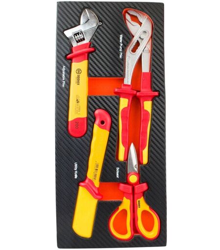 Equipez ou complétez votre servante d'atelier Module mousse 4 outils VDE 1000V Module mousse bicolore 4 outils VDE 1000V Système modulaire pour servante d'atelier, module mousse prédécoupée pour le rangement des outils avec un revêtement type fibre de verre. Mousse résistante haute densité et antidérapante. Détail du module 1 clé à molette 210mm VDE 1000V 1 pince multiprise 250mm VDE 1000V 1 cutter à lame fixe VDE 1000V 1 ciseaux d'électricien VDE 1000V ...