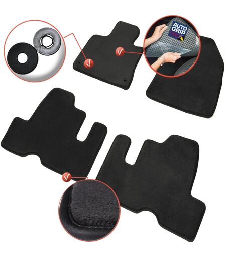 Ce jeu de tapis de sol est fabriqué sur-mesure afin de s'adapter parfaitement à votre CITROËN C4 Picasso (de 02/2013 à 2018). En exclusivité, le tapis conducteur est doté de notre technologie breveté Autogrip®, il sera donc parfaitement fixé au plancher du véhicule. Cela lui évitera de s'échapper sous vos pédales, garantissant ainsi votre sécurité ! Le dos des tapis passager et arrière sont munis d'une sous-couche adhésive en gel, ce qui leur permet d'être antidérapants sur tous types de moquette. Ces tapis pour C4 Picasso permettent une tenue parfaite sur plus de 100.000km. De plus, ils sont solides, faciles d'entretien et résistants à l'usure. Ils sont donc le moyen idéal de préserver la propreté de votre voiture. Les tapis de la gamme > sont livrés avec les clips de fixation d'origine pour une adaptation parfaite à votre véhicule. De qualité constructeur ces tapis sur-mesure sont fabriqués avec une moquette TUFT qui leurs donne l'aspect du velours. Facile d'entretien la densité de 1000g/m² leurs permet d'accrocher beaucoup moins les saletés contrairement à une moquette traditionnelle. Les contours des tapis sont en qualité gansés de couleur noir, pour une finition haut de gamme. Sobres, ils s'adaptent parfaitement à tout type d'habitacle ! ...