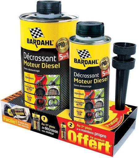 Bardahl Décrassant moteur diesel 5 en 1 - 1 L + 300 ml Le Décalaminant Diesel 5 en 1 est le fruit de nos dernières recherches. Avec sa composition multipropriétés, il permet d'agir sur chaque organe du moteur de manière efficace et sans dangers Décrasse : Injecteurs, Turbo, vanne EGR, Catalyseur & FAP, Admission Rétablit le débit des injecteurs, nettoie et protège le système d'injection Limite les émissions polluantes et facilite le passage au contrôle technique antipollution. Evite la surconsommation de carburant, la perte de puissance et le remplacement de pièces. Description Bardahl Décalaminant moteur 5 en 1 permet de nettoyer votre moteur en ciblant précisément les organes les plus sensibles à l'encrassement moteur ! La forte concentration de substances nettoyante utilise votre gazole comme transporteur afin de nettoyer au mieux votre moteur Mode d'emploi Verser le flacon dans le réservoir puis ajouter 20L de carburant. Rouler normalement jusqu'à épuisement du carburant traité en un ou plusieurs trajets. NB: Un bidon de 300ml offert d'une valeur de 19.99TTC ...