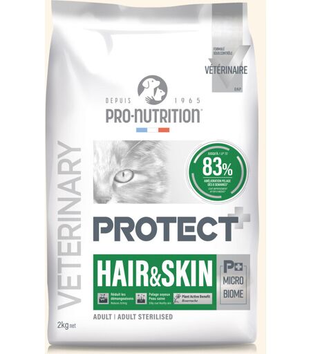 Protect Hair & Skin : L’aliment diététique pour un pelage sain et une peau apaisée 🐱✨ Protect Hair & Skin est un aliment complet spécialement conçu pour soutenir la santé de la peau et du pelage des chats. Il aide à réduire les démangeaisons, à améliorer l’aspect du pelage et à limiter les intolérances alimentaires pouvant impacter la qualité du poil. 🌟 Résultats prouvés ✅ 83% des propriétaires constatent une amélioration du pelage dès 8 semaines (Étude Potloc). 🩺 Réduit les démangeaisons et soutient la peau Enrichi en acides gras essentiels (oméga 6 et oméga 3) issus de la graine de bourrache et de l'huile d'algues pour une peau en pleine santé. ✨ Pelage soyeux et éclatant Formule hyper-digestible, riche en biotine et zinc chélaté pour un poil brillant. Recette à base de poisson, limitant les risques d’intolérances alimentaires pouvant affecter la qualité du pelage. 📋 Indications ✔️ Dermatite atopique ✔️ Soutien en cas de dermatose, dépilation, cicatrisation, pyodermite, hot-spot ✔️ Intolérances alimentaires ✔️ Convalescence ✔️ Cachexie ⚠️ Contre-indications ❌ Croissance ❌ Reproduction ❌ Problèmes hépatiques 🌱 Plant Active Benefit ✔️ Bourrache : soutien de la fonction dermique ✔️ Artichaut : protection du foie et stimulation biliaire ✔️ Psyllium : bon fonctionnement du transit ✔️ Combretum, Boldo : stimulation de la sécrétion biliaire ✔️ Curcuma, Romarin : puissants antioxydants Avec Protect Hair & Skin, offrez à votre chat une alimentation ciblée pour un pelage éclatant et une peau apaisée ! 🐾💙 Mode d'emploi Laisser de l'eau potable à disposition en permanence. Il est recommandé de demander l'avis d'un vétérinaire avant utilisation et avant prolongation de la durée d'utilisation. Afin d'obtenir un résultat optimal, veiller à respecter les quantités journalières recommandées et éviter la distribution de toute autre nourriture. Durée d'utilisation recommandée (en cas de dermatose) : Au départ, jusqu'à 2 mois. Durée d'utilisation recommandée (en cas d'intolérances alimentaires) : 3 à 8 semaines, si les signes d'intolérance disparaissent, cet aliment peut être utilisé, dans un premier temps, jus-qu'à une année. ...