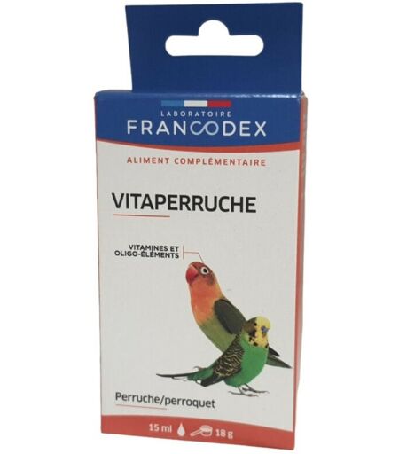 Vitaperruche. Aliment complémentaire pour oiseaux de cage et de volière. Flacons de 18 g + 15 ml. LES + PRODUITS Pour les oiseaux à bec crochu Idéal en période de mue ou de convalescence Complémentation en vitamines et oligoéléments de la ration. convient pour perruche et perroquet Vitaperruche. Aliment complémentaire pour oiseaux de cage et de volière. Flacons de 18 g + 15 ml. LES + PRODUITS Pour les oiseaux à bec crochu Idéal en période de mue ou de convalescence Complémentation en vitamines et oligoéléments de la ration. convient pour perruche et perroquet description: L'alimentation des perruches et perroquets est souvent, trop riche en graines, notamment oléagineuses, et carencée en vitamines et oligo-éléments. VITAPERRUCHE FRANCODEX, est source de choline, qui contribue à limiter l'accumulation de graisses dans le foie, et apporte l'ensemble des vitamines, oligo-éléments et minéraux pour maintenir un équilibre nutritionnel optimal chez les perruches et perroquets, y compris en ...