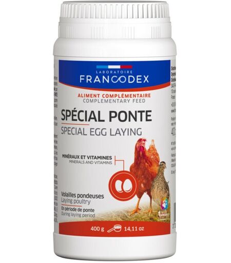 spécial ponte, nouveau pot de 400G pour volaille. En période de ponte, les besoins des volailles augmentent, notamment en minéraux. Les signes de carence peuvent être : des œufs plus petits ou à la coquille molle, une consommation des œufs et surtout des coquilles par les animaux, une diminution voire un arrêt de la ponte. SPÉCIAL PONTE FRANCODEX, à base de minéraux, acides aminés, vitamines et oligo-éléments, apporte des éléments indispensables pour éviter ces carences, et permet ainsi d'assurer le bien-être et la productivité des animaux lors de la période de ponte. Les + produits: -riche en calcium -optimise le taux de ponte -coquilles solides et œufs plus gros Description En période de ponte, les besoins des volailles augmentent, notamment en minéraux. Les signes de carence peuvent être : des œufs plus petits ou à la coquille molle, une consommation des œufs et surtout des coquilles par les animaux, une diminution voire un arrêt de la ponte. SPÉCIAL PONTE FRANCODEX, à base de ...