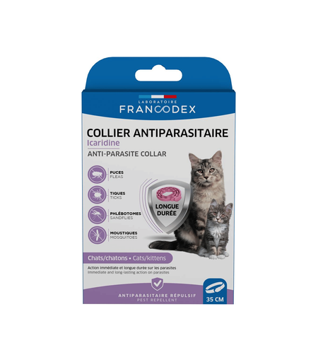 De couleur rose ou noire, les colliers antiparasitaires à base d'Icaridine de Francodex sont des produits conçus pour protéger efficacement les chats contre les parasites externes tels que les puces, les tiques ainsi que tous les parasites volants pendant 4 mois. L’association des 3 substances actives, Icaridine, géraniol et lavendin, permet une action répulsive immédiate et longue durée sur de nombreux parasites volants comme les phlébotomes et les mouches ou rampants comme les puces et les tiques. L’Icaridine présente sur le collier agit directement sur le système sensoriel des parasites : elle transmet un faux message en agissant sur leurs récepteurs sensoriels. Elle les empêche de détecter les substances attractives émanant de l'animal et permet ainsi une action répulsive puissante longue durée. Le collier, d'une longueur maximale de 35 cm, est adapté pour tous les chats à partir de l'âge de 4 mois. Avant d'utiliser le collier, nous vous conseillons de consulter les précautions d'utilisation sur l'étiquette. ...