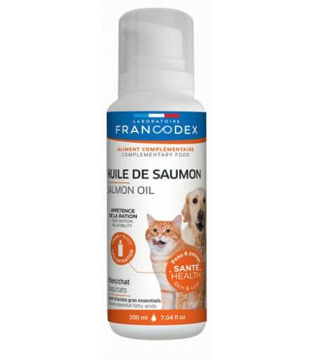 Huile de Saumon. Pour Chiens et Chats. Flacon airless de 200 ml. Source d'oméga-3 et d'oméga-6 : santé de la peau. Augmente l'appétence de la ration. Innovation : flacon airless pour une meilleure conservation. Huile de Saumon. Pour Chiens et Chats. Flacon airless de 200 ml. Source d'oméga-3 et d'oméga-6 : santé de la peau. Augmente l'appétence de la ration. Innovation : flacon airless pour une meilleure conservation. L'HUILE DE SAUMON FRANCODEX contient des acides gras essentiels (oméga-3 et oméga-6). Les acides gras essentiels sont indispensables à de nombreuses fonctions de l'organisme, et une carence peut se traduire entre autres par un pelage terne, des pellicules, et une chute de poils. D'autre part, certaines situations particulières exigent une plus grande quantité d'acides gras essentiels dans la ration, comme par exemple l'exercice intense ou prolongé, la gestation, la lactation ou encore la croissance. La supplémentation de la ration quotidienne en huile de saumon permet de ...