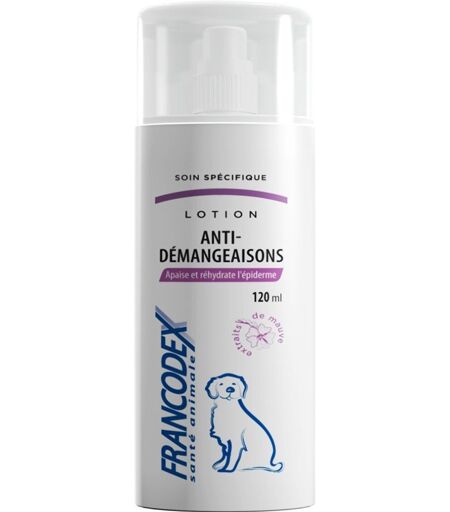 La lotion anti-démangeaisons Francodex soulage rapidement votre chien. Effet apaisant : les extraits de mauve calment les irritations. Effet réhydratant : les huiles hydroxyéthylénées réhydratent l'épiderme. Existe en 120ml. ...