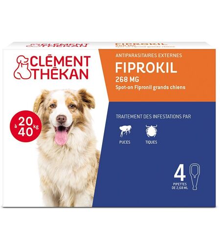 PIPETTE ANTI-PUCES ET ANTI-TIQUES : FIPROKIL Grands Chiens protège votre chien contre les parasites les plus courants : puces et tiques DOUBLE ACTION PRÉVENTIVE ET CURATIVE : FIPROKIL Grands Chiens élimine les puces et les tiques et protège votre chien d'une infestation ou ré-infestation EFFICACITÉ PROUVÉE : FIPROKIL Grands Chiens protège efficacement votre chien contre les puces jusqu'à 8 semaines et contre les tiques jusqu'à 4 semaines PROTÈGE LES CHIENS : FIPROKIL Grands Chiens convient aux chiens de 20 à 40 kg APPLICATION FACILE : FIPROKIL Grands Chiens possède un système anti-goutte qui permet la libération de la solution uniquement par pression sur la partie centrale de la pipette Indications Traitement des infestations par les puces (Ctenocephalides spp.), tiques (Rhipicephalus sanguineus, Ixodes ricinus, Dermacentor reticulatus) chez le chien de 20 kg et 40 kg. Médicament pouvant être intégré dans un programme thérapeutique contre la Dermatite par Hypersensibilité aux Piqûres de Puces (DHPP).Contre-IndicationsChiot de moins de 8 semaines, chiot de moins de 2 kg. Ne pas utiliser chez les lapins. Ne pas utiliser chez le chat, pour éviter tout surdosage. Ne pas utiliser chez l'animal malade ou convalescent. Allergie à l'un des composants.Conseils d'utilisationVoie d'administration : externe. Une pipette de 2,68 ml par animal. A appliquer directement sur une zone que l'animal ne peut pas lécher.Compositionbutylhydroxyanisole (E 320) 0,536 mg, butylhydroxytoluène (E 321) 0,268 mg, alcool benzylique ((E 1519), diéthylène glycol monoéthyl étherConditionnement4 pipettes de 2,68 mlIl est indispensable de demander l’avis de votre vétérinaire ou de votre pharmacien. Si les symptômes persistent, consultez votre vétérinaire. ...