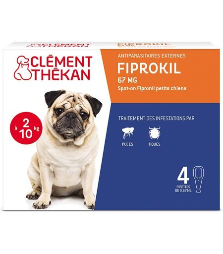 PIPETTE ANTI-PUCES ET ANTI-TIQUES : FIPROKIL Petits Chiens protège votre chien contre les parasites les plus courants : puces et tiques DOUBLE ACTION PRÉVENTIVE ET CURATIVE : FIPROKIL Petits Chiens élimine les puces et les tiques et protège votre chien d'une infestation ou ré-infestation EFFICACITÉ PROUVÉE : FIPROKIL Petits Chiens protège efficacement votre chien contre les puces jusqu'à 8 semaines et contre les tiques jusqu'à 4 semaines PROTÈGE CHIENS ET CHIOTS : FIPROKIL Petits Chiens peut être utilisé chez les chiens et les chiots âgés de 2 mois et pesant au moins 2 kg APPLICATION FACILE : FIPROKIL Petits Chiens possède un système anti-goutte qui permet la libération de la solution uniquement par pression sur la partie centrale de la pipette Contre-Indications Ne pas utiliser chez le chiot âgé de moins de 2 mois et/ou pesant moins de 2 kg en l'absence d'informations disponibles. Ne pas utiliser chez les animaux malades (maladies systémiques, fièvre, ...) ou convalescents. Ne pas utiliser chez les lapins car des effets indésirables parfois létaux peuvent se produire. Ce produit est spécifiquement développé pour le chien. Ne pas utiliser chez le chat, pour éviter tout surdosage. Ne pas utiliser en cas d'hypersensibilité au principe actif, ou à l'un des excipients. Conseils d'utilisation Appliquer le produit directement sur la peau en fonction du poids de l'animal, comme suit : 1 pipette de 0,67 ml pour un chien pesant entre 2 kg et 10 kg. Schéma thérapeutique : Pour lutter efficacement contre les infestations par les puces et/ou les tiques, le schéma thérapeutique peut tenir compte de la situation épidémiologique locale. En l'absence d'étude d'innocuité, l'intervalle minimum de traitement est de 4 semaines. Usage externe uniquement. Détacher une pipette et la tenir en position verticale. Donner de petits coups sur la partie étroite de la pipette pour s'assurer que le contenu est bien descendu dans la partie centrale de la pipette. Rompre l'extrémité autocassable de la pipette pour spot-on en suivant la ligne gravée. Écarter les poils de l'animal jusqu'à ce que la peau soit visible. Placer l'embout de la pipette directement sur la peau. Presser doucement plusieurs fois pour vider entièrement le contenu de la pipette en un ou deux points le long du dos. Veiller à appliquer le produit sur une zone que l’animal ne puisse pas lécher et s’assurer que les animaux ne se lècheront pas entre eux après le traitement. Ne pas appliquer une quantité excessive de produit sur un même point pour éviter que les poils ne deviennent collants. Néanmoins, si cela se produit, l’aspect collant disparaîtra dans les 24 heures après l’application. Précautions d'emploi: Chez l'animal : Les animaux doivent être pesés avec précision avant le traitement. Eviter tout contact avec les yeux de l'animal. En cas de contact accidentel avec les yeux, laver immédiatement et abondamment les yeux avec de l'eau. Ne pas appliquer le produit sur une peau abîmée. Veiller à appliquer le... ...