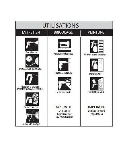 Ce produit est habituellement livré en 24 jours ouvrables. Mecafer - Compresseur 50L 2Hp 10 bar Ce compresseur à air Mecafer sera votre allié en toute situation, il est maniable et pratique. A la fois atypique et innovant, le Fitfty est la nouvelle référence du marché. Peu encombrant (cuve verticale 50 L), il est très maniable (grandes roues et guidon) et très pratique (manomètre et régulateur à portée de mains, support porte-outils). Ce compresseur satisfera tous les bricoleurs avertis et exigeants. Avec son groupe performant de compression 2 HP (sans entretien) et sa cuve de 50 L/10 bar, le Fifty procure une réserve d'air qui est suffisante pour gonfler, souffler, agrafer et peindre.... Les + produits de ce compresseur à air Mecafer sont : - Pression maxi. : 10 bar - Vertical et complet - Portable et léger - Nouvelle tête 2HP sans huile - Grand guidon, très maniable Caracteristiques techniques spéciales : Débit d'air restitué à 7 bar : 126 l/min Débit d'air restitué à 3 bar : 140 l/min Temps de remplissage 0 à 7 bar maxi 2 mn Puissance électrique (50hz) : 1,5 kW Garantie 2 ans ...