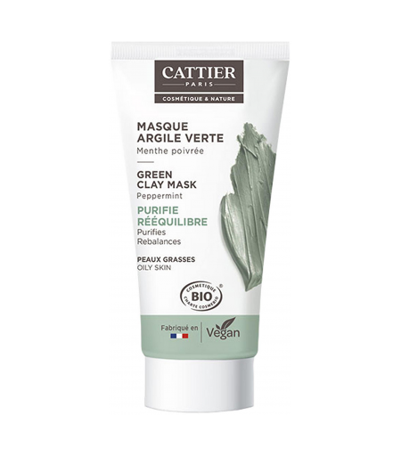 Pour prendre soin des peaux mixtes et grasses, le masque à l’argile verte Cattier est enrichi en argile blanche et verte.Absorbant, revitalisant, il régule l’excès de sébum grâce à l’argile verte.Au Ph neutre, l’argile blanche apaise et favorise l’élimination des toxines.L’huile de jojoba, l’huile essentielle de menthe poivrée bio et de romarin bio viennent compléter la formule pour hydrater, protéger et tonifier votre peau.Purifiée et reminéralisée, votre peau est plus belle, douce et éclatante. Tous les produits Cattier labellisés BIO sont contrôlés et certifiés par ECOCERT (organisme indépendant reconnu par l’État). De même, la composition, l’emballage, la fabrication, le conditionnement, le stockage et la gestion de l’énergie et des déchets sont contrôlés par ECOCERT. ...