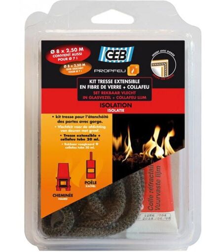 Description générale Le kit tresse extensible + Collafeu Propfeu est idéal pour l'étanchéité thermique des portes d'inserts, chaudières, fours, poêles et cheminées. Composé d'une tresse ronde en fibre de verre et d'une colle réfractaire, ce kit permet de réaliser une étanchéité efficace et durable. Spécifications techniques Diamètre de la tresse : 8 mm Longueur de la tresse : 2,5 m Tube de colle : 20 ml Tenue en température : jusqu'à 500°C en utilisation continue Température de fusion : 840°C Excellente résistance à l'abrasion et aux vibrations Imputrescible Bonne résistance aux acides (sauf à l’acide fluorhydrique et phosphorique) et aux bases diluées Compatibilité et accessoires Convient pour les portes d'inserts, chaudières, fours, poêles et cheminées Peut être utilisé pour des diamètres de 7 à 8 mm Installation Pour une installation réussie, suivez ces étapes : Nettoyez les supports d’application. Humidifiez les supports poreux pour une meilleure adhérence. Appliquez la colle sur ...