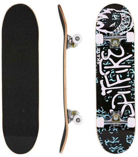 Skateboard Complet en Bois d'Érable avec Roues en PU - Type Lettre Dimensions de l'emballage : 80 x 21 x 14 cm, Poids brut : 2,7 kg, Matière : érable + support en aluminium de mouette + roues amortissantes en PU, Capacité de charge maximale : 250 kg (super durable), Adapté à l'âge : groupes de personnes mesurant 1,2 m ou plus Description du produit : Sept couches de planche concave à double gauchissement en érable avec surface avant antidérapante (solide et persistante, surface de planche en macadam antidérapante et renforcée). Transfert thermique à l'arrière + support de mouette + amortisseur en PU jaune (support de mouette plus solide, amortisseur 95A à haute élasticité plus sécurisé, résistant à l'usure, réinitialisation rapide pour un meilleur confort et une fluidité accrue lors du patinage et des virages). Roulements ABEC-7 en acier au carbone + roues blanches ou transparentes en PU (nouvelles roues 50 x 40 mm en PU infusé, rebond élevé de 70 %, dureté de 90A, grande élasticité et résistance à l'usure pour une glisse silencieuse). Nos planches à roulettes complètes sont équipées d'un chariot en aluminium robuste et de roues en PU pour économiser temps et énergie, convenant à tous les niveaux de compétition. Les débutants et les utilisateurs expérimentés peuvent en profiter pleinement ! Précautions d'utilisation du produit : Bien régler les roues avant l'utilisation pour qu'elles tournent librement. Ajuster l'élasticité du coussin avec l'écrou du pont de verrouillage selon votre utilisation. Huiler régulièrement l'axe de la roue pour augmenter sa lubrification et réduire la résistance au glissement. Les débutants doivent d'abord apprendre à glisser en douceur et éviter de commencer par des figures. Ne pas patiner sur des surfaces mouillées ou rugueuses. Lorsque vous voulez sauter du skateboard, vérifiez qu'il n'y a pas de personnes ou d'objets à heurter autour de vous. Si vous devez remplacer des pièces, assurez-vous qu'elles ont les mêmes spécifications que les pièces d'origine. Éviter tout contact avec l'eau, car le skateboard est en bois. L'expansion et la contraction thermique causées par l'eau peuvent fissurer la planche. En cas de saleté, essuyez avec un chiffon sec. ...
