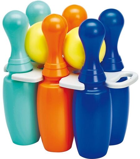 6 quilles et 2 boules rangées sur leur support avec poignée facile à transporter. Conseillé dès 18 mois. Origine France Garantie. ...