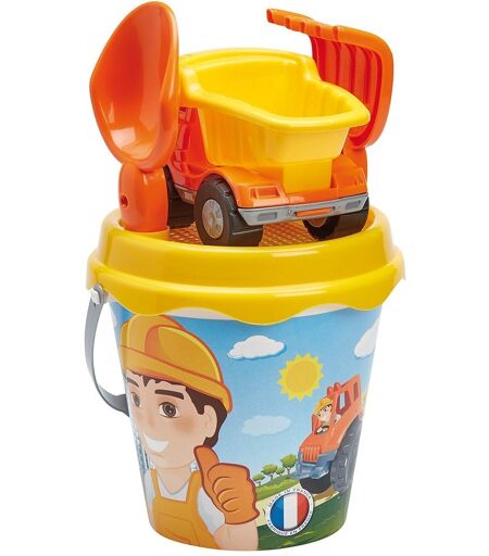 Seau garni camion décor TP 17cm ECOIFFIER Un seau de 16 cm décoré selon le theme des travaux publics, garni d'un tamis, d'une pelle, d'un râteau et d'un camion benne. Des 18 mois. ...