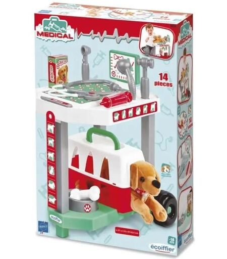 Place au Vétérinaire Avec cette clinique vétérinaire, les petits soignants en herbe pourront examiner minutieusement un adorable petit chien en peluche et lui administrer son traitement. L'inventaire de la Clinique Ce kit contient : 1 table d¿examen roulante 1 chien en peluche et sa caisse de transport 1 écuelle 1 os 1 seringue à piston 1 marteau à réflexes 1 otoscope 1 douchette 1 boîte de croquettes Prendre Soin des Autres Jouets Ecoiffier propose aux enfants des jeux médicaux pour s'amuser à soigner les humains et les animaux, et ainsi dédramatiser les situations de soins. Jouer pour Mieux Grandir C'est en imitant les adultes et en manipulant différents jouets que les enfants apprennent à appréhender le monde qui les entoure, à devenir plus habiles et plus autonomes au quotidien. Des Jouets Origine France Garantie Jouets Ecoiffier est une entreprise familiale qui fabrique tous ses jouets en France. ...