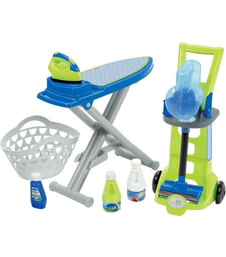 RACONTE MOI UNE HISTOIRE Matériel de ménage 3 en 1 d' Ecoiffier comprend 3 jouets en un seul produit : un chariot avec un aspirateur balai et ses deux suceurs, une planche à repasser et son fer à repasser, et enfin une corbeille à linge remplie de flacons factices de produits ménagers. Votre enfant va pouvoir faire comme les grands et vous aider au ménage, ou presque ! Il sera tout fier d'imiter vos gestes et prendra confiance en lui en s'amusant. Conseillé dès 18 mois. SÉCURITÉ Jouet à monter par un adulte responsable. Référence fabricant : 1762 ...