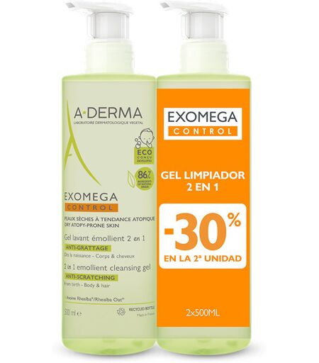 A-Derma Exomega Control Gel émollient 2en1 pack 2 x 500 ml