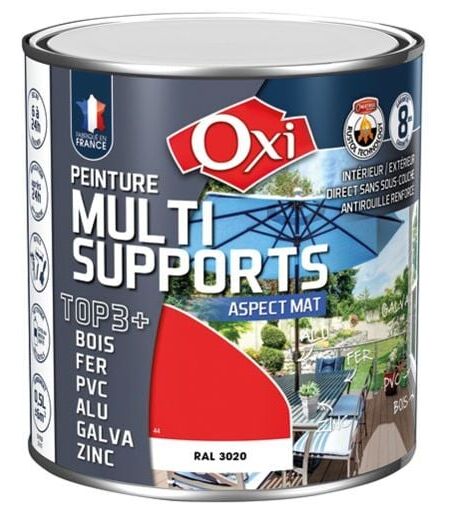Existe en plusieurs coloris La peinture mat multi-support TOP3 de 500 mL en coloris rouge vif RAL3020 de la marque Oxi est destinée à la décoration et la protection de nombreux matériaux bois, fer, PVC, métaux non ferreux, intérieurs et extérieurs. TOP3+ est une formule solvantée composée de résines de qualité supérieure et renforcée grâce à la « RUSTOL Technology ». Sur BOIS, TOP3+ est microporeux et protège de l'humidité, il s'oppose, sans cloquer, au vieillissement et à la dégradation des bois neufs ou anciens : volets, menuiseries, portails, bardages… Sur fer, TOP3+ est anticorrosion, il pénètre le métal rouillé pour en chasser l’humidité, il donne une résistance exceptionnelle contre la corrosion : portails, ferronneries, tuyauteries, bardages, chaudronnerie… Pour de multiples supports, TOP3+ s’oppose à la dégradation des matériaux, permet leur rénovation et leur décoration. Ses qualités d’accrochage permettent une application sur presque tous les supports : PVC, plastiques, ...