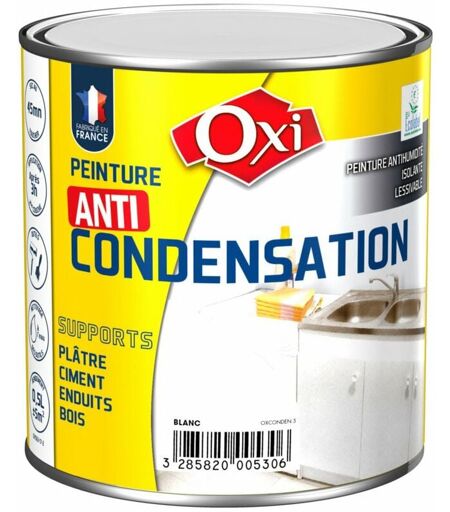 Description générale La peinture anti-condensation est une peinture monocouche acrylique spécialement conçue pour isoler et rénover les murs et plafonds des pièces humides, telles que les cuisines et salles de bains. Sa formulation unique, contenant des milliards de microsphères remplies d'air, empêche la condensation de la vapeur d'eau sur les surfaces, améliorant ainsi le confort et limitant les déperditions énergétiques de chauffage. Spécifications techniques Aspect : blanc mat Contenance : 0,5 L Rendement : 8 à 10 m²/L Temps de séchage : sec au toucher en 45 minutes, seconde couche après 3 heures Nettoyage des outils : à l'eau immédiatement après usage Compatibilité et accessoires Application : convient pour plâtres, ciments, plaques cartonnées, enduits, matériaux bruts, bois, anciennes peintures et toiles de verre Pour les supports spéciaux (fer, bois résineux, plastiques), appliquer une sous-couche appropriée Installation Avant l'application, assurez-vous que les surfaces soient ...