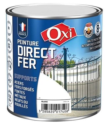 La peinture mat Direct Fer de 250 mL en coloris noir RAL9005 de la marque Oxi est une peinture brillante, lisse destinée à la décoration des fers neufs ou anciens même rouillés sans sous-couche. Elle s’applique aussi bien en intérieur qu’en extérieur sur fers forgés, grilles, mobiliers de jardin, objets décoratifs, luminaires, objets anciens... Excellente protection antirouille. Très bonne résistance aux chocs et aux agressions extérieures. Peinture prête à l’emploi. Bien remuer avant l'utilisation à l’aide d’une spatule large en insistant sur le fond du pot afin d’obtenir un mélange homogène. Appliquer par des températures comprises entre 10 et 25°C, sans humidité et hors courant d’air. Ne pas appliquer sur des supports surchauffés (en plein soleil) ou en cas de risque de pluie. L'humidité ambiante excessive et le manque de ventilation ralentissent le séchage de la peinture. Sur les anciennes peintures, prévoir un dépolissage au papier de verre grain 320 puis dépoussiérer. Sur les ...