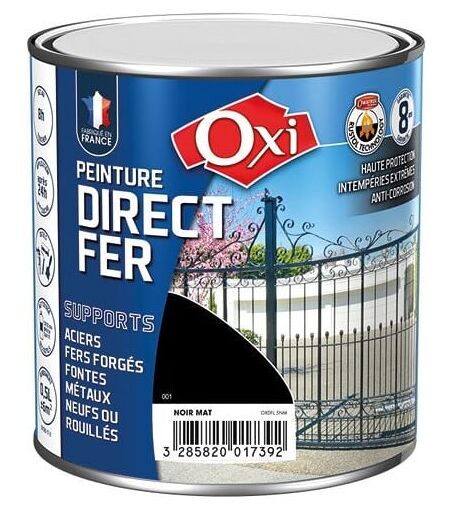 La peinture mat Direct Fer de 500 mL en coloris noir RAL9005 de la marque Oxi est une peinture brillante, lisse destinée à la décoration des fers neufs ou anciens même rouillés sans sous-couche. Elle s’applique aussi bien en intérieur qu’en extérieur sur fers forgés, grilles, mobiliers de jardin, objets décoratifs, luminaires, objets anciens... Excellente protection antirouille. Très bonne résistance aux chocs et aux agressions extérieures. Peinture prête à l’emploi. Bien remuer avant l'utilisation à l’aide d’une spatule large en insistant sur le fond du pot afin d’obtenir un mélange homogène. Appliquer par des températures comprises entre 10 et 25°C, sans humidité et hors courant d’air. Ne pas appliquer sur des supports surchauffés (en plein soleil) ou en cas de risque de pluie. L'humidité ambiante excessive et le manque de ventilation ralentissent le séchage de la peinture. Sur les anciennes peintures, prévoir un dépolissage au papier de verre grain 320 puis dépoussiérer. Sur les ...
