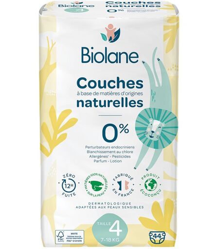 Fort de son expertise de la peau des bébés, Biolane lance en 2020 une gamme de couches conçues à partir de matières 100% d’origines naturelles pour les surfaces en contact avec la peau du bébé.Éco-conçues et fabriquées en France, elles sont garanties sans perturbateurs endocriniens ni substances toxiques. Les couches Biolane garantissent jusqu’à 12h de protection, grâce à un cœur absorbant composé de 3 niveaux et une cellulose dense qui absorbe les liquides rapidement. Quant au voile extérieur, il est micro-aéré pour laisser respirer la peau.Sans aucune substance toxique ou irritante, les couches Biolane sont parfaitement adaptées à tous les types de peau. Fabriquées en France avec une priorité pour des matériaux naturels et éco-conçus, elles assurent une performance optimale pour garder les fesses de votre bébé bien au sec jusqu’à 12h.BénéficesRespectueuses de la peau des bébésSans perturbateurs endocriniens, sans chlore, allergènes, pesticides, parfum, ni lotionConfortablesCouches douces, épaisses et absorbante pour que votre bébé soit à l’aise et bien au sec pendant 12hRespectueuses de l’environnement Fabriquées en France, nous couches disposent d’un coussin d’absorption à 80% biodégradable à base de cellulose issue de forêts gérées durablementMode d'emploiPrenez la taille de couches correspondant au poids de votre bébé.CompositionMatières en contact avec la peau à base d'ingrédients biosourcés (naturels) :Voile de contact : BIO PE/PLA (canne à sucre et amidon de maïs).Barrière anti-fuite : BIO PE/PP (canne à sucre et polypropylène).Corps ultra-absorbant :Coussin moelleux : pâte de cellulose certifiée FSC et TCF (blanchie sans chlore). Microbilles absorbantes (SAP) : polyacrylate de sodium.Une enveloppe respirante et un système d'attaches efficace:Voile extérieur, voile de maintien et d'acquisition : Polyéthylène ; Polypropylène ; Polyester.Système de fixation (bande confort, attaches et oreilles élastiques) : Polyéthylène ; Polypropylène ; Polyester ; ColleSystème de fermeture auto-agrippant. Élastiques sans latex. ...