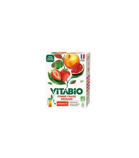 Vitabio Pomme Grenade Fraise Bio 4 Gourdes de 100 g, un encas gourmand 100% fruits qui allie les saveurs sucrées de la pomme, de la fraise et de la grenade à l'action naturelle de l'acérola.En plus de régaler vos ...