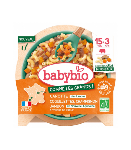 Parapharmacie > Bébé & Maman > Alimentation bébé > Repas bébé Babybio Carottes Coquillettes Champignon Jambon de 15 Mois à 3 Ans Bio 200 g