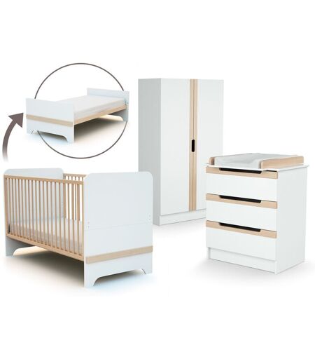 AT4 - Chambre bébé lit, commode à langer et armoire Blanc et Hêtre Verni