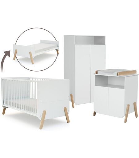 AT4 Chambre bébé lit, commode à langer et armoire Blanc et Hêtre Verni