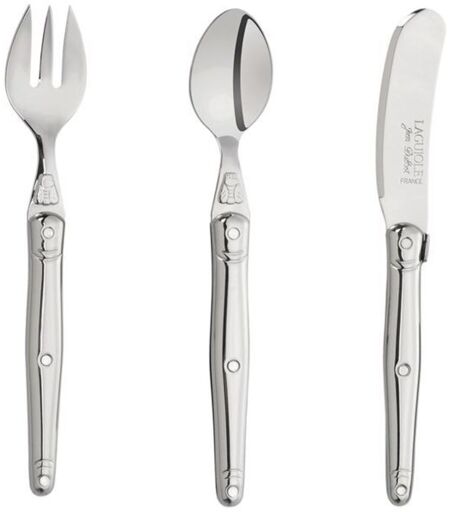 Set 3 couverts enfant - Laguiole Inox - Avec ce set de couverts Laguiole, votre enfant aura lui aussi ses couverts Laguiole mais adaptés à la taille de sa bouche et de ses petites mains, pour faire comme les grands ! - Comprend une cuillère, un couteau lame ronde et une fourchette de taille et de forme adaptées - 100 % inox - Nettoyage facile : passe au lave-vaisselle - Livré en coffret cadeau en kraft - Fabriqué en France. CARACTERISTIQUESVidéo : Fiche produit constructeur / fournisseur : Opérateur économique responsable : DUBOST COLAS PRADEL 20 RUE DE LA COUTELLERIE LE BOURG 63250 VISCOMTAT France Email / Site web ...