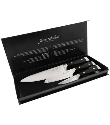 Découvrez le Coffret de 3 Couteaux Massif en acier inoxydable signé Jean Dubost, une marque de renommée depuis quatre générations dans la conception de couteaux de cuisine de haute qualité. Chaque couteau de ce coffret est équipé d'un manche en résine ultra résistante, assurant une prise en main confortable et durable. Ce coffret comprend : -Un couteau d'office de 9 cm : Idéal pour découper, éplucher et émincer avec précision. -Un couteau Santoku de 13 cm : Parfait pour émincer les légumes, poissons crus, sushis et viandes avec finesse. -Un couteau Chef de 20 cm : Conçu pour trancher aisément tous types d'aliments. Pour préserver la qualité et la durabilité de vos couteaux, privilégiez toujours un lavage manuel et séchez-les avec un chiffon doux après chaque utilisation. Pour un tranchant optimal, aiguisez vos couteaux manuellement. Faites l'expérience de l'excellence et de la tradition avec le Coffret 3 Couteaux Massif de Jean Dubost. Matière : Inox Couleur : Noir Longueur : 32.2 cm ...