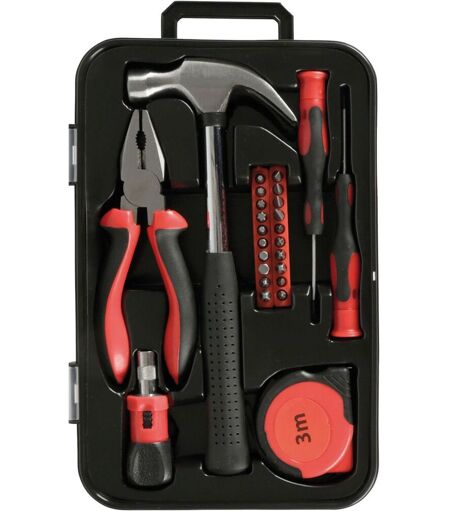 1 marteau arrache-clou, 1 pince universelle, 1 mètre ruban 3 m, 1 mini tournevis porte-embout à cliquet, 2 tournevis de précision, 20 embouts vissage en acier chrome vanadium. Mallette plastique 27,5x17,5x4 cm. ...