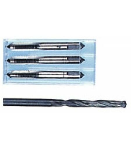 Taraud à main. Pas : 50/100, diamètre : 3 mm. Acier au chrome. Jeu 3 tarauds (ébaucheur, intermédiaire, finisseur) + 1 forêt HSS. ...