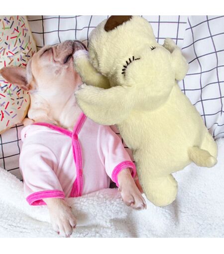 Cute Heartbeat Pet Toy Plush Puppy Training Comfortable Snuggle Sleep Interactive Anxiety Relief Sleep Aid Doll ToyFeature:1. The plush toy has a built-in heartbeat device, imitating the real heartbeat, helping pets transition to a new home and reducing pets' stress2. Rebuild intimacy with the warmth of a soft body and a ""true"" beating heartbeat, reducing pet tension, anxiety, and bad behavior.3. Made of soft and comfortable fabric, cats and dogs can snuggle and rest beside it, just like mom.Specification:Material: plush, PP cotton, built-in heartbeat machineSize: 20 * 35 * 18cm/7.8*13.7*7inFunctions: soothe, accompany, relieve pet stress and anxiety, etcBattery: 2*AAA (not included)Note:Due to the different monitor and light effect, the actual color of the item might be slightly different from the color showed on the pictures. Thank you!Please allow 1-2cm measuring deviation due to manual measurement. 1 X Heartbeat Pet Toy ...
