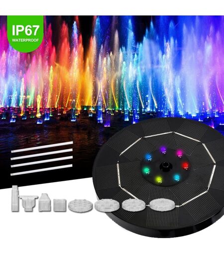 Solar Powered Water Fountain Outdoor Swimming Pool Pond Bird Bath Decoration Garden Waterfall Solar Water Fountain Pump KitFeature:1. Adopt brushless motor, long service life and low failure rate.2. With four support rods to prevent the wind from blowing the fountain to the shore of the pond during use (the length of a single support rod is 10cm).3. A sponge filter is added to the water inlet of the water pump to prevent the water pump from being blocked. The sponge filter can be removed for cleaning.3.5W:1. Electric energy diversion and battery power supply function, when the solar energy is converted into electric energy during the day, 70% of the power is supplied to the fountain, and 30% of the battery is charged. The batteries power the fountains and lights at night.2. With the same volume, the power of the solar panel is increased by increasing the density of the monocrystalline silicon wires.3. 7 colorful LED lamp beads, the light function is automatically activated after the sun goes down, and the light mode is automatic breathing mode.4. With four struts to prevent the wind from blowing the fountain to the shore of the pond during use (the length of a single strut is 10cm)5. The controller has anti-dry function. When the water level is lower than 3cm, the anti-dry function is activated, the water pump will not spray water, and the solar panel will only charge the battery.6. A sponge filter is added to the water inlet of the water pump to prevent the water pump from being blocked. The sponge filter can be removed for cleaning.7. The 1800mAh battery can continuously supply power for the water pump and colorful lights for 4 hours when fully charged.Special Note: The battery has a protection function. In order to prevent the battery from self-discharging during transportation, please place the product in the sun for 1 minute to activate the product when using it for the first time.Specification:Product weight: 315 grams with packagingPacking size: 17.5*17.5*4.5cm1.0W/1.5W: Water pump voltage: 7VPump power: 1.0WMaximum flow: 190L/HMaximum lift: 110cmMaximum spray height: 65cmSolar panel voltage: 7VPET lamination technology:Product list: Solar water pump X 1, Nozzles X 6, Nozzle base X 1, Adapter X 1, Manual X 1, Anti-collision struts X 4Service life: ?10000HoursWorking hours: 8:00A.M.-5:00P.M.Startup: The pump cannot work without sunlight, when the pump receives sufficient sunlight, the pump will start up within 3 seconds.1.0W: Solar panel power: 1.0WSolar panel size: 130mm (monocrystalline silicon)1.5W:Solar panel power: 1.5WSolar panel size: 160mm (monocrystalline silicon)3.5W:Solar panel voltage: 4.5VSolar panel power: 3.5WSolar panel size: 160mm (diameter 160MM,)Number of colorful lights: 7 LED breathing colorful lights (automatically change color)Color of strut: White, BlackWater pump:Water pump voltage: DC 4.5VPump power: 1.0WEquipped with anti-dry burning: Yes, anti-dry burning is integrated with the control panelMaximum lift:... ...