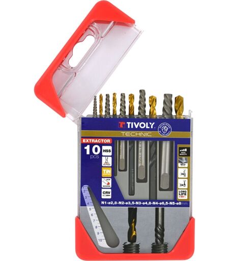 TIVOLY Coffret de 10pcs, contenant 5 Extracteurs de goujons et vis cassées N1, N2, N3, N4, N5 et 5 Forets hss steam tin assortis D2,5-3,2-4,8-6,5-8mm