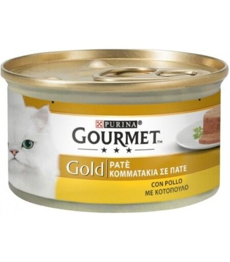 Gourmet Gold Pate Poulet Purina 85 grammes. Des bouchées moelleuses à base de viande ou de poisson finement hachées et associées à de petits morceaux de légumes tendres pour offrir à votre chat le plaisir d'une texture délicate et appétissante. ...