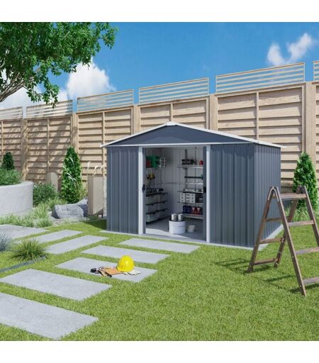 DESCRIPTION GÉNÉRALE L'abri de jardin métal gris Yardmaster de 6,44 m² allie design moderne et fonctionnalité. Sa couleur anthracite et ses cadres de porte bruts ajoutent une touche d'élégance. Conçu pour durer, il est garanti 15 ans contre la corrosion et dispose d'entretoises intérieures pour un maintien optimal. Les portes coulissantes permettent un accès facile et protègent contre la pluie. SPÉCIFICATIONS TECHNIQUES Hauteur totale : 2,02 m Surface totale : 7,18 m² - 3,03 m de large x 2,37 m de profondeur Surface extérieure au sol : 6,44 m² - 2,85 m de large x 2,26 m de profondeur Surface utile : 6,24 m² - 2,81 m de large x 2,22 m de profondeur Hauteur des murs : 1,60 m Matière principale : Métal galvanisé avec finition laquage polyester Épaisseur des murs : 3/10 mm Épaisseur du toit : 3/10 mm Couleur des murs : Gris anthracite Couleur du toit : Alu Couleur des portes et fronton : Gris anthracite Dimension ouverture : 1,20 m x 1,58 m Type de portes : Double porte coulissante ...
