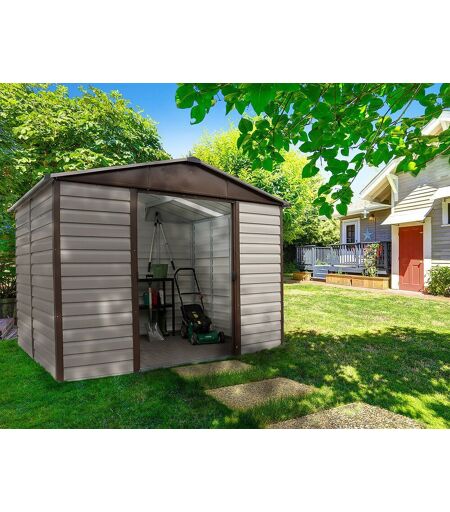 Cet abri de jardin YARDMASTER d'une surface 5,30 m² offre un grand volume de stockage, d?espace de rangement et une grande hauteur de murs, idéal pour protéger votre matériel de jardinage et stocker le mobilier de jardin, vélos et jouets d?extérieur. La double porte coulissante de 1,25 m facilite l?accès et permet d?utiliser au mieux la surface de cet abri de jardin Très lumineux grâce à ses deux panneaux de toit translucides, vous pourrez aussi, selon vos envies, y aménager un atelier pour bricoler. Coloris gris châtaigne pour un superbe rendu esthétique. Ce coloris à l'avantage de pouvoir restituer une teinte lumineuse pour une intégration harmonieuse dans le jardin et de pouvoir se fondre dans votre extérieur avec un coloris plus sombre en fin de journée. Caractéristiques techniques Hauteur totale : 2,24 m Surface totale : 5,96 m² - 3.03 m de large x 1.97 m de profondeur Surface extérieure au sol : 5,30 m² - 2.85 m de large x 1.86 m de profondeur Surface utile : 5,11m² - 2.81 m de large x 1.82 m de profondeur Hauteur des murs : 1,80 m Matière principale : Métal galvanisé + finition laquage polyester Epaisseur des murs : 3/10 -ème de millimètre Epaisseur du toit : 3/10 -ème de millimètre Couleur des murs : Gris Châtaigne Couleur du toit : Alu Couleur portes et fronton : Marron foncé Dimension ouverture : (largeur x hauteur) 1,20 m. x 1,78 m. Type de portes : Double porte coulissante intérieure Type de serrure : Avec poignées pour fermeture par cadenas (non fourni) Plancher Kit : non fourni Kit d'ancrage : Inclus Panneaux de toit translucides : oui Gouttières : oui Garantie : Métal garanti 15 ANS contre la perforation par la rouille ...