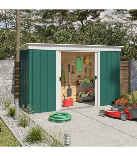 DESCRIPTION GÉNÉRALE L'abri de jardin en métal Yardmaster de 3,55 m² est idéal pour ranger vos outils, mobilier extérieur et équipements de loisirs. Sa structure en acier galvanisé assure une excellente résistance à la corrosion et aux intempéries. Avec son design élégant et sa couleur verte, il s'intègre parfaitement dans votre jardin. SPÉCIFICATIONS TECHNIQUES Surface utile : 2,80 m² Surface hors tout : 3,55 m² Dimensions intérieures : 280 x 100 cm Dimensions extérieures : 284 x 104 cm Dimensions hors-tout : 298 x 119 x 174 cm Poids : 70 kg Épaisseur du toit : 3/10 Épaisseur des portes : 5/10 Portes coulissantes : 120 x 158 cm Kit d'ancrage inclus Garantie anti-corrosion : 10 ans INSTALLATION Livré prêt à monter avec une notice détaillée pour un montage rapide. UTILISATION Conçu pour un rangement pratique et sécurisé de vos équipements de jardin. ...