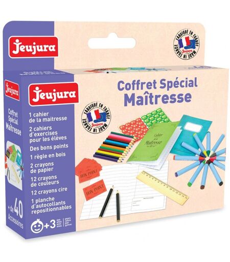 Un coffret pour s'amuser à jouer à la maîtresse et réaliser de jolis dessins. Contenu : - 1 cahier de maîtresse avec emploi du temps et relevés de notes - 2 cahiers d'exercices pour les élèves - des bons points - 1 règle en bois - 2 crayons de papier - 6 crayons de couleur - 12 crayons cire - 1 planche d'autocollants repositionnables Dimensions de la boîte (en carton) : 17 x 15 x 4 cm. Age minimum : 3 ans ...