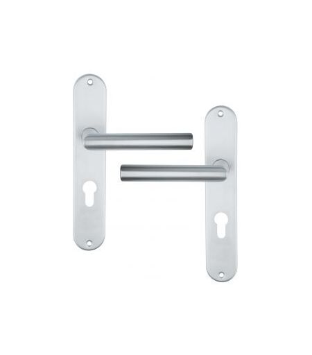 Poignée de porte modèle DUBLINO. Garniture sur rosace ronde - ensemble de 2 poignées de porte extérieure - design en Aluminium anodisé argent, fonction Clé I pour serrure avec cylindre européen. Carré de 7/70 # 2 Pièce(s) Matière de la plaque : Aluminium Matière de la poignée : Aluminium Finition de la plaque : Argent Finition de la poignée : Argent Carré (mm) : 7 Accessoires fournis : - 2 vis relieuses - 1 carré 7 mm-Entraxe fixation (mm) : 195 Entraxe Béquille/ trou de perçage (mm) : 70 Hauteur plaque (mm) : 225-Largeur plaque (mm) : 40 Ressort de rappel : non Epaisseur de porte (mm) : 36 à 42- ...
