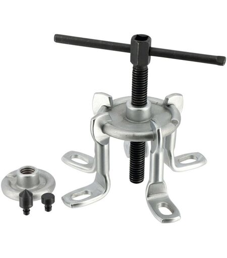 Caractéristiques techniques 5 griffes d'extraction avec perçage en acier (chrome-vanadium) 2 platines de maintien des griffes avec chromage mat (Ø 62 et 100 mm) Vis de serrage trempée (Ø 10 x 185 mm) avec poignée coulissante de 190 mm, entrainement par carré mâle 12,5 mm (1/2") ou clé de 21 mm 2 pièces de pression (plate et pointu). Convient aux moyeux à 3, 4, 5 et 6 trous et aux tambours de frein avec un espacement des trous allant jusqu'à 200 mm. ...
