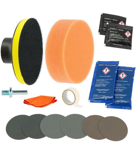 Description générale Le kit de rénovation des phares optiques est conçu pour restaurer vos phares usés par le temps, en éliminant les dégradations telles que le jaunissement, l'oxydation et les rayures. Il est également adapté pour rénover les feux arrière, les fenêtres de bateaux, et les pare-brises de motos. Spécifications techniques 1 ruban adhésif pour protéger la carrosserie. 1 plateau de polissage Ø75mm avec fixation auto-agrippante. 6 disques abrasifs Ø75mm : 2 grains 800, 2 grains 1200, 2 grains 2000. 1 tampon de polissage Ø75mm avec fixation auto-agrippante. 2 sachets de pâte à polir. 1 chiffon microfibre rectangulaire. 2 sachets de vernis protecteur. Compatibilité et accessoires Compatible avec tous les types de phares en plastique et peut également être utilisé sur d'autres surfaces en plastique, comme les feux arrière et les pare-brises. Installation Le processus de rénovation se fait en quatre étapes simples : Protéger la carrosserie avec le ruban adhésif. Poncer les ...