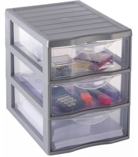 Mini tour de rangement avec 3 tiroirs en polypropylene de coloris gris. Format A5. Excellente empilabilité. Poignée ergonomique. Systeme d'arret a l'ouverture. Compatible avec les autres tailles de la gamme ORGAMIX pour faire un bloc tiroir. Fabrication française. Dimensions : 25,5x18,5x25,5 cm. ...