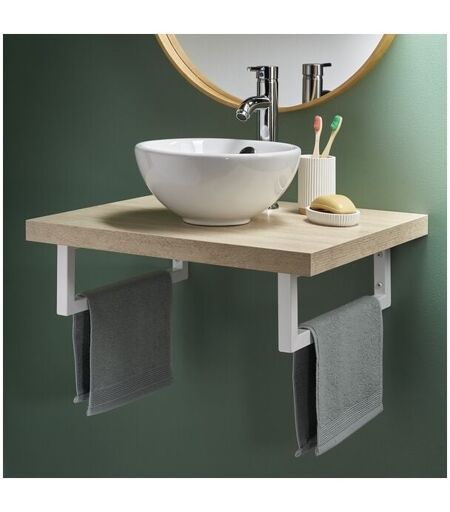 Lot de 2 équerres sous lavabo blanches Permet de porter un plan de travail, plan de toilette (lavabo) etc. Avec un porte serviette intégré Support équerre plan de toilette Charge maxi 75 kg la paire Longueur 43 x Hauteur 15 x épais. 2.5cm ...