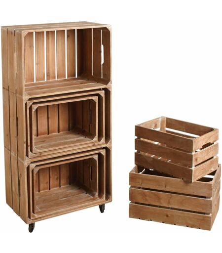 Aspect Finitions Patiné Matériau principal Bois Dimensions Hauteur (en cm) 100,00 Longueur (en cm) 49,00 Profondeur (en cm) 28,00 Autres caractéristiques Composition 1 rangement étagère + 6 caisses (3 caisses 42,5 x 28 x 25 cm et 3 caisses 36,5 x 24 x 22 cm) Informations complémentaires Sur roulettes Poids (en kg) 5,00 Etagère en caisse en bois patiné trois étages, avec 6 caisses en bois assorties. ...