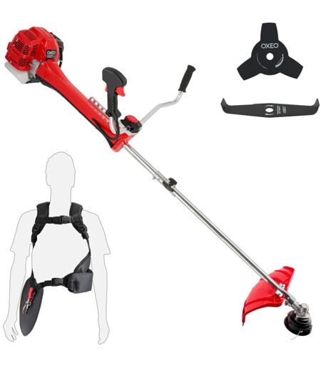 Oxeo - Débroussailleuse thermique professionnelle 62 cm³ - 2 tps - 2en1 - Coupe-bordure - Tête double fil - 2 lames - Anti-vibration