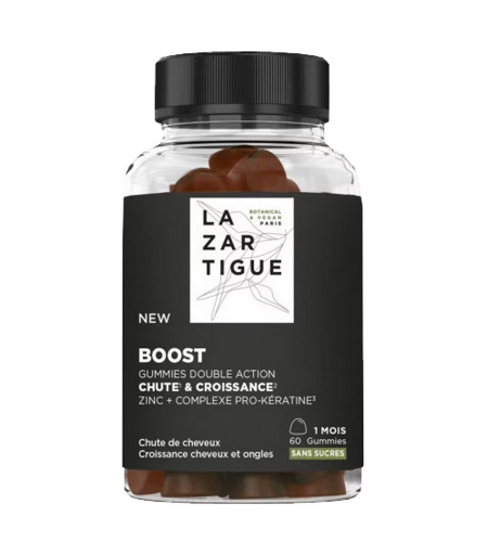 Le complément alimentaire BOOST Gummies aide à lutter efficacement contre la chute de cheveux₁ progressive ou réactionnelle, grâce à une double action inédite qui freine la chute₁ et stimule la croissance². Aide à freine la chute₁ – Stimule la croissance₂ – Renforce les cheveux et les ongles₃ Arôme naturel, délicieuse saveur de framboise-cassis. 2 gummies à prendre par jour. Vegan – Sans sucres - Sans colorant artificiel – Arômes naturels - Fabriqué en France ₁Grâce au Cheveux de Vénus₂Grâce au Zinc Tout au long de la vie, les cheveux tombent et se renouvellent. Une perte normale représente environ 100 cheveux par jour. Au-delà, la chute est anormale et résulte d’un dérèglement du cycle capillaire. Lorsqu’elle est due à un impact hormonal comme la ménopause ou à un facteur héréditaire chez l’homme, la chute est dite “progressive” car elle s’installe au fil du temps. Pour freiner la chute progressive et maintenir une chevelure saine, il est important de fortifier les cheveux fragilisés et de stimuler la croissance de follicules pileux existants. Si vous constatez une chute brutale et massive de vos cheveux à la suite d’un événement ponctuel tel qu’une période de stress, une grossesse, une maladie, un régime alimentaire ou un changement de saison, la chute est dite de type réactionnel. La chute réactionnelle n’est pas définitive mais il convient d’y remédier rapidement pour la freiner et ne pas fragiliser le cheveu de manière définitive. Afin de lutter efficacement contre la chute de cheveux, il est également nécessaire de stimuler la croissance. Il est important d’adopter une alimentation équilibrée afin de garantir le cycle physiologique des bulbes pileux. Ce gummies aide à freiner la chute de cheveux₁ progressive comme réactionnelle et stimule la croissance₂ en associant la puissance d’extraits botaniques à un complexe minéral et vitaminique : • Action anti-chute : la Capillaire de Montpellier, aussi appelée Cheveux de Vénus₁, contient des flavonoïdes anti-oxydants. Cette plante aide à prévenir la chute de cheveux. • Stimule la croissance : le Zinc₂ est un oligo-élement qui contribue à la synthèse normale des protéines telle que la kératine; composant principal des cheveux et des ongles. • Fortifie les cheveux : le complexe PRO-kératine Lazartigue contient une association de vitamines B8, B6 et B9 qui jouent un rôle dans la synthèse des acides aminés. Les acides aminés sont les principaux composant des protéines qui constituent la kératine. • Protège les cheveux : la Vitamine Cnaturellement anti-oxydante, contribue à protéger les cheveux des radicaux libre, connus pour abîmer et affaiblir les cheveux. Avec ces gummies anti-chute de cheveux, les cheveux et ongles retrouvent force, densité et brillance₃ : • Embellit les cheveux et ongles : le Sélénium, oligo-élément anti-oxydant, joue un rôle bénéfique sur la qualité des phanères. • Prévient l’apparition des cheveux blancs : le Cuivre, en contribuant à la pigmentation normale des cheveux, est... ...